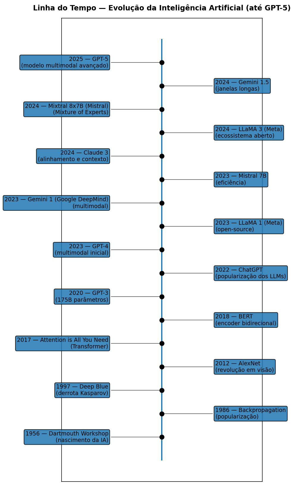 ax.set_yticks([])"Linha do Tempo — Evolução da Inteligência Artificial (até GPT-5)", fontsize=11.5, weight="bold", pad=12)