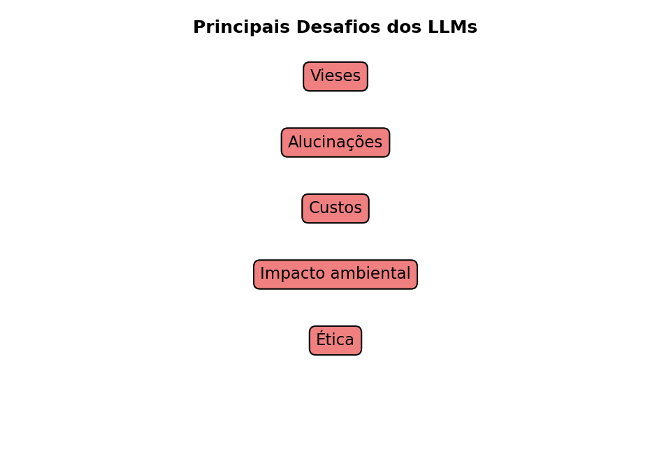# Gera e salva "images/llm-challenges.png"from pathlib import Pathimport matplotlib.pyplot as pltout = Path("images"); out.mkdir(parents=True, exist_ok=True)outfile = out /"llm-challenges.png"fig, ax = plt.subplots(figsize=(6.5, 4.5), dpi=150)items = ["Vieses","Alucinações","Custos","Impacto ambiental","Ética"]# posição vertical para as caixasys = [0.85, 0.70, 0.55, 0.40, 0.25]for text, y inzip(items, ys): ax.text(0.5, y, text, fontsize=11, ha="center", va="center", bbox=dict(boxstyle="round,pad=0.4", facecolor="lightcoral", edgecolor="black"))ax.text(0.5, 0.95, "Principais Desafios dos LLMs", ha="center", fontsize=12, weight="bold")ax.set_xlim(0, 1)ax.set_ylim(0, 1)ax.axis("off")plt.tight_layout()plt.savefig(outfile, bbox_inches="tight")plt.close()print(f"Figura salva em: {outfile}")
