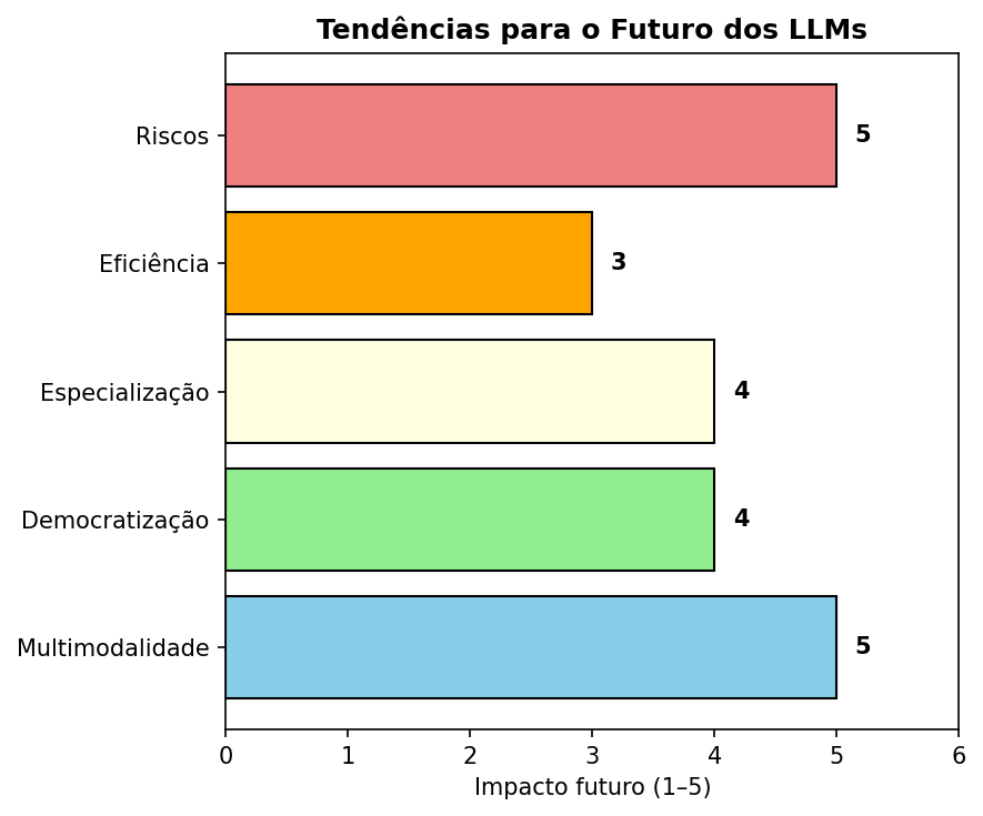 # Gera e salva "images/llm-future-trends.png"from pathlib import Pathimport matplotlib.pyplot as pltout = Path("images"); out.mkdir(parents=True, exist_ok=True)outfile = out /"llm-future-trends.png"items = ["Multimodalidade","Democratização","Especialização","Eficiência","Riscos"]values = [5, 4, 4, 3, 5]colors = ["skyblue", "lightgreen", "lightyellow", "orange", "lightcoral"]fig, ax = plt.subplots(figsize=(6, 5), dpi=150)bars = ax.barh(items, values, color=colors, edgecolor="black")ax.set_xlim(0, 6)ax.set_xlabel("Impacto futuro (1–5)")ax.set_title("Tendências para o Futuro dos LLMs", fontsize=12, weight="bold")# labels ao lado das barrasfor bar in bars: w = bar.get_width() ax.text(w +0.15, bar.get_y() + bar.get_height()/2,str(int(w)), va="center", fontsize=10, weight="bold")plt.tight_layout()plt.savefig(outfile, bbox_inches="tight")plt.close()print(f"Figura salva em: {outfile}")