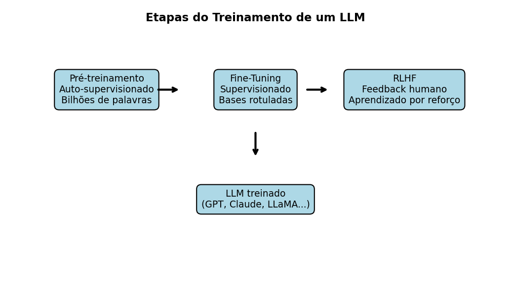 # Gera e salva "images/llm-training-stages.png"from pathlib import Pathimport matplotlib.pyplot as pltout = Path("images"); out.mkdir(parents=True, exist_ok=True)outfile = out /"llm-training-stages.png"fig, ax = plt.subplots(figsize=(7, 4), dpi=150)boxes = {"pretrain": {"text": "Pré-treinamento\nAuto-supervisionado\nBilhões de palavras", "xy": (0.2, 0.7)},"finetune": {"text": "Fine-Tuning\nSupervisionado\nBases rotuladas", "xy": (0.5, 0.7)},"rlhf": {"text": "RLHF\nFeedback humano\nAprendizado por reforço", "xy": (0.8, 0.7)},"final": {"text": "LLM treinado\n(GPT, Claude, LLaMA...)", "xy": (0.5, 0.3)}}# caixasfor box in boxes.values(): ax.text(box["xy"][0], box["xy"][1], box["text"], fontsize=9, ha="center", va="center", bbox=dict(boxstyle="round,pad=0.5", facecolor="lightblue", edgecolor="black"))# setasax.annotate("", xy=(0.35, 0.7), xytext=(0.3, 0.7), arrowprops=dict(arrowstyle="->", lw=2))ax.annotate("", xy=(0.65, 0.7), xytext=(0.6, 0.7), arrowprops=dict(arrowstyle="->", lw=2))ax.annotate("", xy=(0.5, 0.45), xytext=(0.5, 0.55), arrowprops=dict(arrowstyle="->", lw=2))ax.text(0.5, 0.95, "Etapas do Treinamento de um LLM", ha="center", fontsize=11, weight="bold")ax.axis("off")plt.tight_layout()plt.savefig(outfile, bbox_inches="tight")plt.close()print(f"Figura salva em: {outfile}")